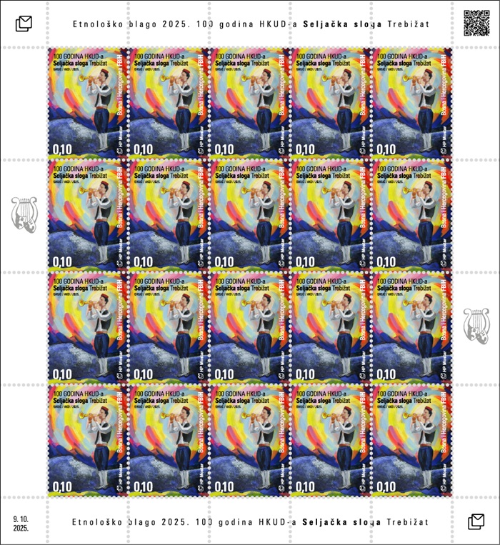 Motiv na poštanskoj marki predstavlja trubača u tradicionalnoj hercegovačkoj narodnoj nošnji u kojoj je nastupao Puhački orkestar i folklor HKUD „Seljačka sloga“. (Trpimir Grgić)