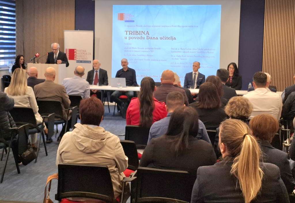 Tribina u povodu Dana učitelja održana je u srijedu na Fakultetu prirodoslovno-matematičkih i odgojnih znanosti Sveučilišta u Mostaru (FPMOZ SUM) u organizaciji Hrvatske akademije za znanost i umjetnost (HAZU) u Bosni i Hercegovini.