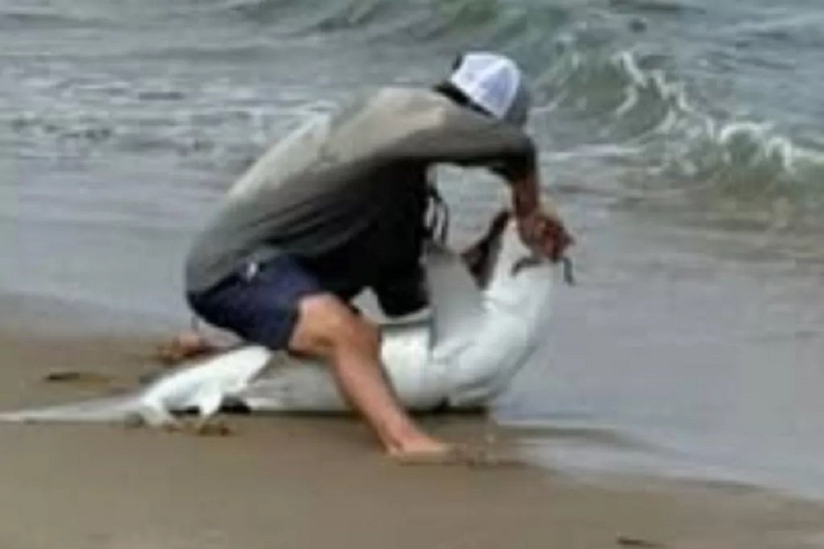 Čini se da skupina muškaraca skida udicu iz snažnih čeljusti morskog psa kako bi pustili grabežljivca natrag u ocean, izvještava Mirror.