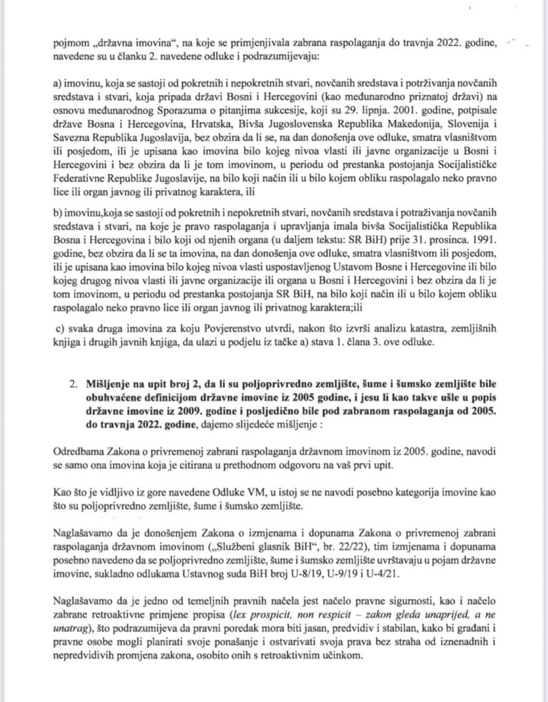 Ministarstvo je posebno naglasilo načela pravne sigurnosti i zabrane retroaktivne primjene zakona, ističući da građani, investitori i lokalne vlasti moraju imati jasan i predvidiv pravni okvir za planiranje razvoja i korištenje imovine.