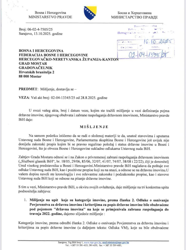 U svom mišljenju (akt br. 06-02-4-7505/25 od 13.10.2025.), Ministarstvo pravde BiH jasno je utvrdilo: