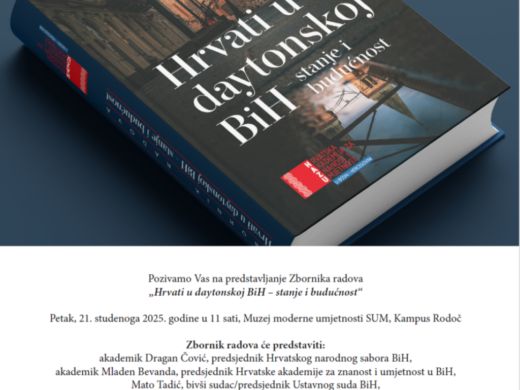 Predstavljanje Zbornika radova „Hrvati u daytonskoj BiH – stanje i budućnost“ upriličit će se u petak, 21. studenoga s početkom u 11 sati u Muzeju moderne umjetnosti Sveučilišta u Mostaru.