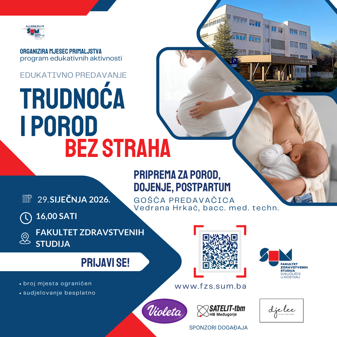 Alumni klub Fakulteta zdravstvenih studija Sveučilišta u Mostaru, u okviru programa „Mjesec primaljstva”, najavljuje održavanje edukativnog predavanja pod nazivom „Trudnoća i porod bez straha”. Predavanje će se održati u četvrtak, 29. siječnja 2026. godine, s početkom u 16:00 sati u prostorijama Fakulteta zdravstvenih studija.