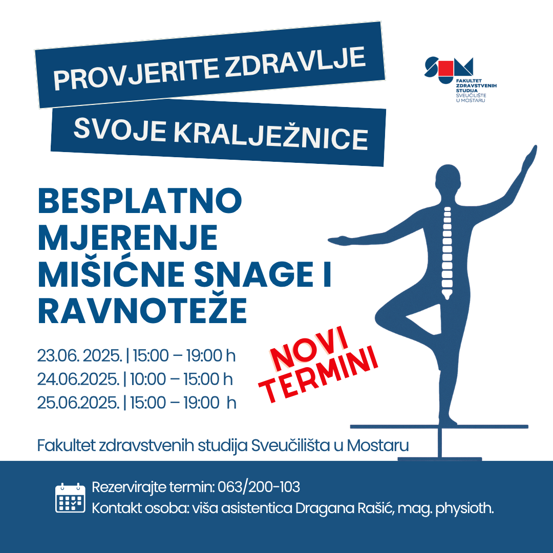 Zbog velikog interesa građana za besplatno mjerenje mišićne snage i ravnoteže, Studij fizioterapije Fakulteta zdravstvenih studija Sveučilišta u Mostaru organizira dodatne termine ove javnozdravstvene inicijative.