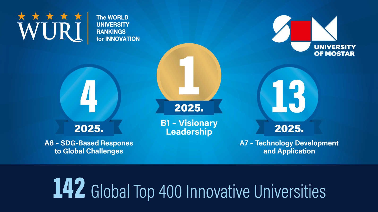 Prema najnovijem izdanju prestižne svjetske rang-liste World University Rankings for Innovation (WURI) za 2025. godinu, Sveučilište u Mostaru ostvarilo je izniman rezultat zauzevši 142. mjesto u ukupnom poretku među 400 najinovativnijih sveučilišta svijeta, u konkurenciji više od 1283 prijavljene institucije iz 87 zemalja. Ovaj uspjeh predstavlja značajan iskorak u odnosu na prošlogodišnje 167. mjesto, potvrđujući stabilan rast SUM-a i njegovu sve veću međunarodnu prepoznatljivost u području inovacija u obrazovanju, digitalne transformacije i društvene odgovornosti.
