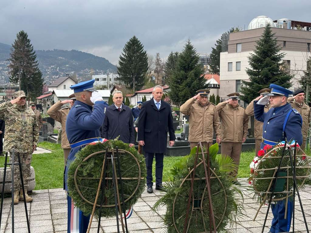 Izaslanstvo Ministarstva odbrane i Oružanih snaga Bosne i Hercegovine, predvođeno zamjenikom ministra odbrane BiH za politiku i planove Slavenom Galićem položilo je danas vijence na Rimokatoličkom groblju “Sveti Josip” u Sarajevu, a u povodu obilježavanja 20. obljetnice utemeljenja 1. pješačke (gardijske) pukovnije OS BiH i 33. obljetnice utemeljenja Hrvatskoga vijeća obrane.