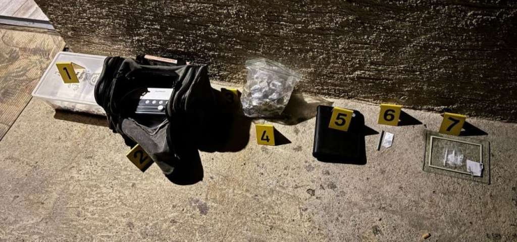 Izvršenim pretresom, u okviru kojeg je korišten i policijski pas za otkrivanje narkotika, pronađeno je 3.173 grama praškaste materije koja svojim izgledom asocira na opojnu drogu amfetamin (speed), dvije ručne bombe i okvir za pištolj, digitalna vaga za precizna mjerenja i dva aparata za vakumiranje.