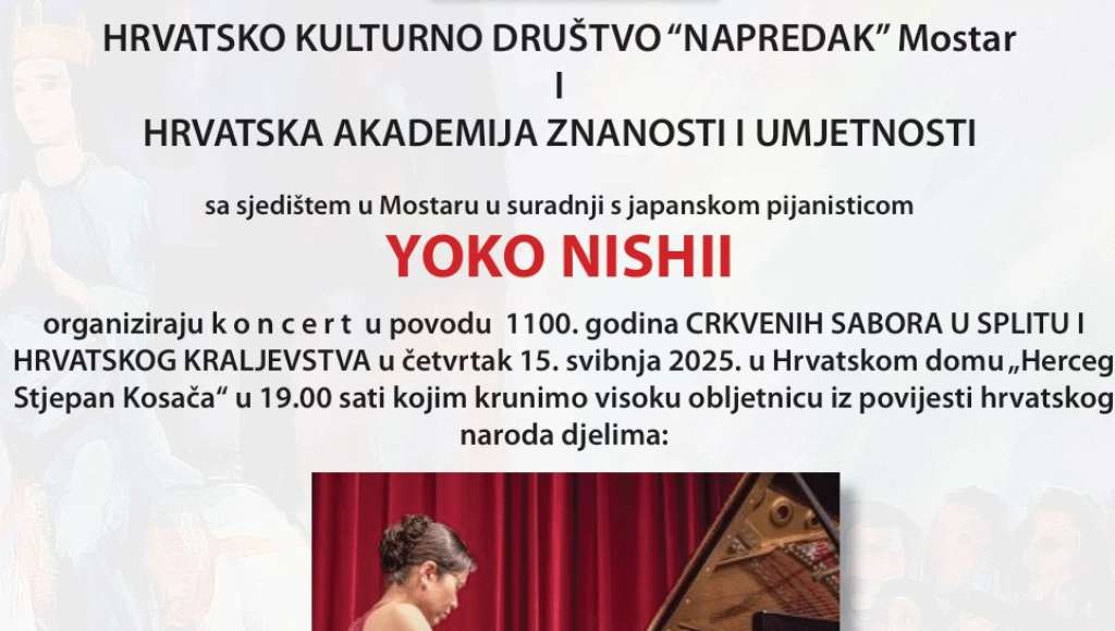 Također, Hrvatsko kulturno društvo Napredak Mostar i Hrvatska akademija znanosti i umjetnosti sa sjedištem u Mostaru u suradnji s japanskom pijanisticom Yoko Nishii u četvrtak, 15. svibnja, organiziraju koncert u Hrvatskom domu hercega Stjepana Kosače u 19 sati.